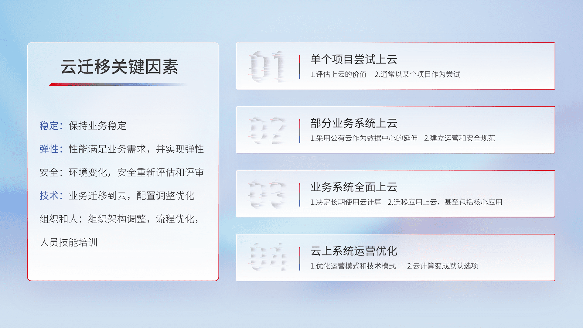 结合实际业务,,,,从规划设计、、、云平台选型、、云原生改造、、数据迁移、、、集成交付,,,迁移全过程为客户识别最佳上云路径,,,做好风险识别管理,,,,设计网络架构、、、身份权限、、安全审计合规、、、操作审计、、、日志审计、、、监控告警策略、、、多站点容灾设计等,,,,对云上基础设施进行整体规划,,,,提升IT治理水平,,,以满足弹性、、高可用、、、高性能的需求。。。。